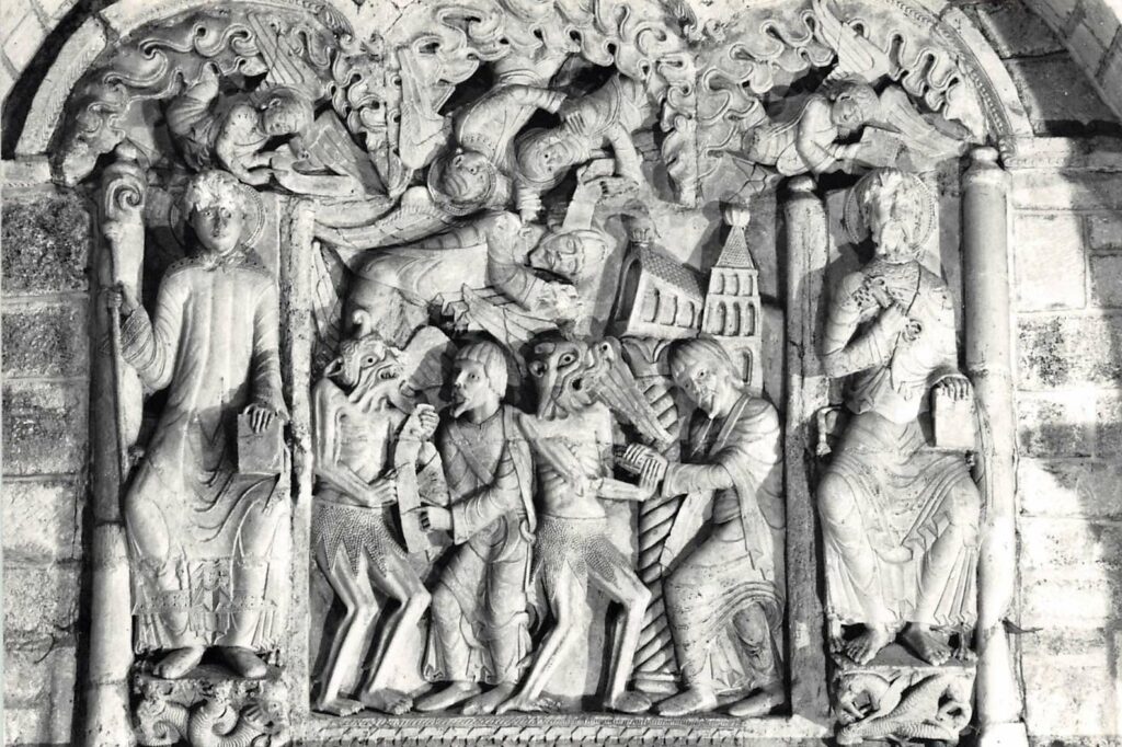 La sculpture monumentale du XIIe siècle est un art essentiellement monastique. Les sculpteurs sont des moines, ou, comme le soulignait déjà Emile Mâle. Ceux-ci puisent dans les livres une large partie du programme iconographique qu’ils font représenter aux portes de leurs églises. Tout monastère possède en effet une bibliothèque, au sein de laquelle la Bible, les pères, l’exégèse et la théologie constituent l’essentiels des volumes. Certains de leurs manuscrits sont enluminés et les miniatures qui y prennent place ont souvent influencé le décor sculpté des portails et des tympans.